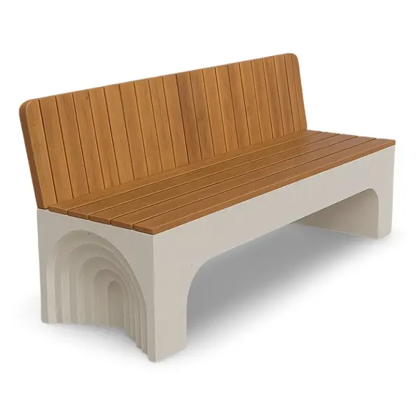 Скамейка «Европа» со спинкой изготовлена из усиленного архитектурного бетона (марка М500). В стандартной комплектации указана цена за технологию «мытый бетон» с добавлением природных камней (мраморная или гранитная крошка).